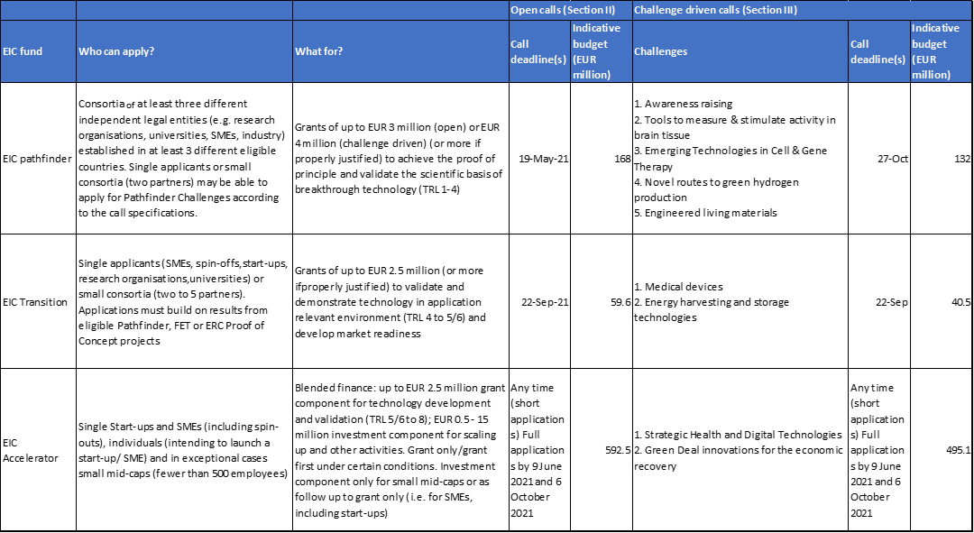 Each funding programme within EIC has both open calls for innovation and challenge driven calls. Open calls have no pre-defined thematic priorities and are designed to cut across different scientific, technological, sectoral, and application fields or represent novel combinations of those different sectors. The challenge driven approach provides funding to address specific technological and innovation breakthroughs. These challenges consider EU priorities for transitioning to a green, digital, and healthy society as well as the overall strategic planning for Horizon Europe and the input of stakeholders, experts, and the EIC pilot Advisory Board.